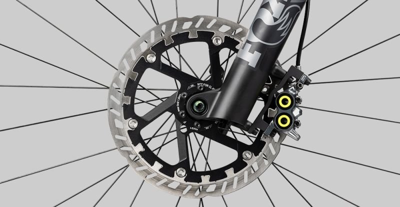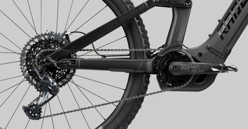 Der flügelähnliche Überwurf, welcher Ober und Unterrohr verbindet, macht nicht nur optisch was her, sondern bietet auch in technischer Hinsicht ein absolutes Highlight. Sowohl der Carbon-Hauptrahmen als auch die Trunnion-Dämpferaufnahme bewirken eine Menge Steifigkeit und Stabilität. Wie auch beim RENDER bietet die untere Dämpferaufnahme gleichzeitig einen Teil der Wippe, welche dem Rahmen eine einzigartige Kinematik und besonders hohe Stabilität des Hinterbaus verleiht. Der 750Wh große Akku wird durch eine Patrone in das Unterrohr integriert, die für geräuscharmes Fahren und einen wackelfreien Sitz sorgt. Durch eine gummierte Abdeckung, welche das Unterrohr abschließt, lässt sich der Akku problemlos und schnell entnehmen. Mittels der am Sitzrohr befindlichen Ladebuchse lässt sich der Akku ohne Entnahme laden. Das Schaltwerk wird am neuen, herstellerübergreifend genormten UDH hanger montiert, der Speedsensor ist elegant in der Bremsscheibe und Kettenstrebe integriert, sodass der klassische Speichenmagnet der Vergangenheit angehört.